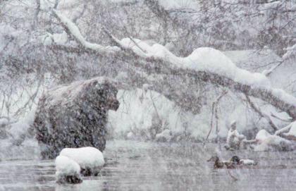 下大雪是棕熊们求之不得的好天气.因为寒冷能使红大马哈鱼更虚弱,它们捕到鱼的几率更大。