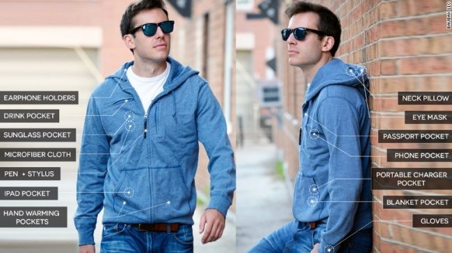 3. 地表最强旅行外套。这件外套有10多个功能,包括耳机孔、饮料口袋、墨镜口袋、超细纤维拭镜布、笔口袋、平板口袋、手部保暖口袋、可拆式颈枕、眼罩、护照口袋、手机口袋、行动电源口袋、手套等。