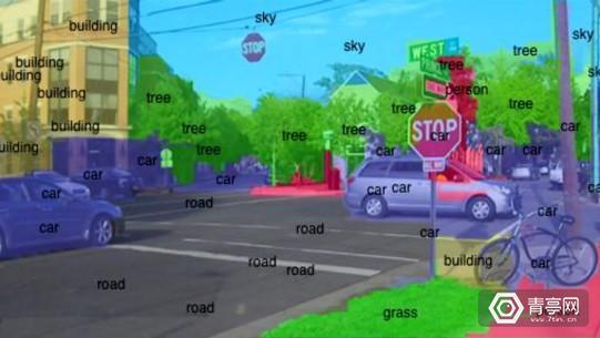 科学家正在研究的,是让智能手机和其他的设备能够理解、并迅速识别出处在摄像头视场里的物体。如上图,街景中的物体都被打上了用于描述物体的文本标签,而完成这一过程的处理器要比传统手机处理器快上120倍。