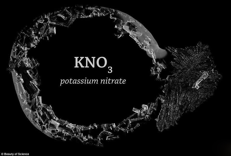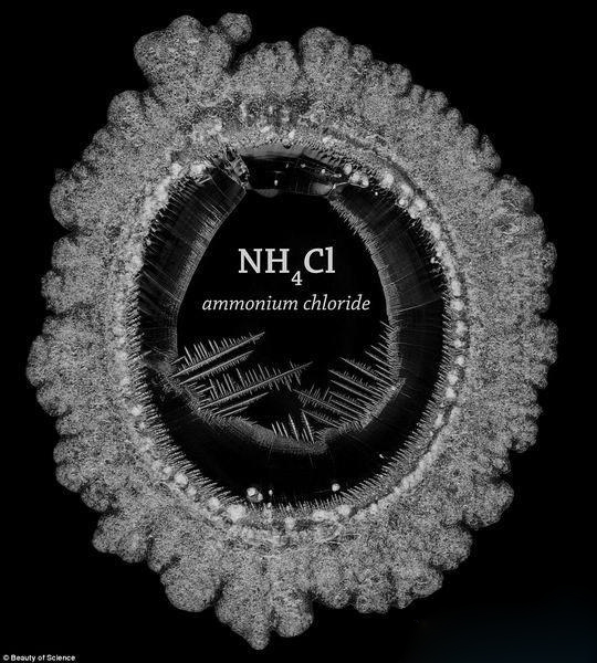 观察饱和水溶液液滴结晶化是非常单调的,但是一位教授非常认真地记录下来结晶化的整个过程,他认为这一自然反应是美丽的艺术作品。如图所示,晶体的颜色和结构形成微小的对称雪花结构。