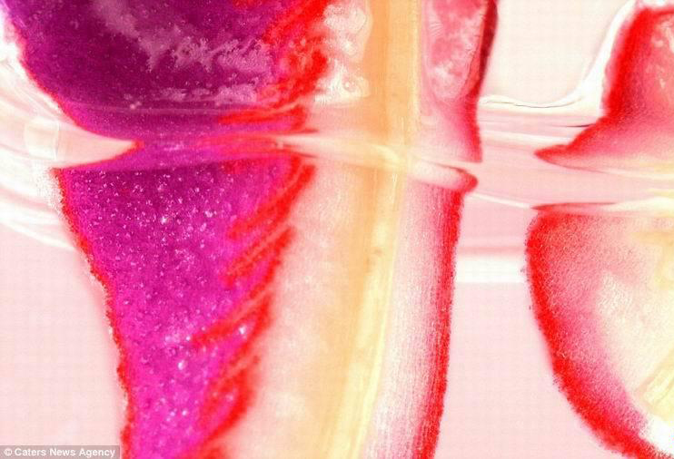 两年前,梁言拍摄了一些照片,当时是将酸溶液滴在花卉或者紫甘草(图中)形成的反应过程。
