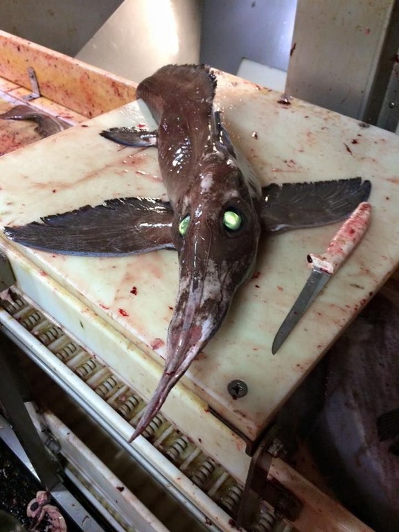 加拿大海域再度发现有着奇异外型的怪鱼,23岁的渔唐纳(Scott Tanner)在纽芬兰与拉布拉多省大浅滩捕获到它,这条鱼有着像翅膀一样的鱼鳍,尖尖的鼻子再加上会发出青光的眼睛,罕见外型连捕鱼经验丰富的老渔民也都是第一次见到,还有人说有着“青色眼睛”的怪鱼其实是外太空来的异形生物。