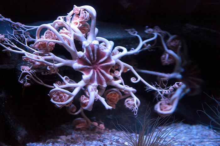 事实上,这个生物为阳燧足(brittle star)的其中一个种类,是海星的近亲,因此有着和海星极为相似的外貌,具有一个圆形或五角形的中央体盘,并向外延伸出5个腕足,但不同于海星,阳燧足的腕足较为细长且有分节,其摆动的方式就像蛇尾;而影片中的这种阳燧足被通称为海篮(basket star),其特色就是拥有复杂网状分支的腕足。