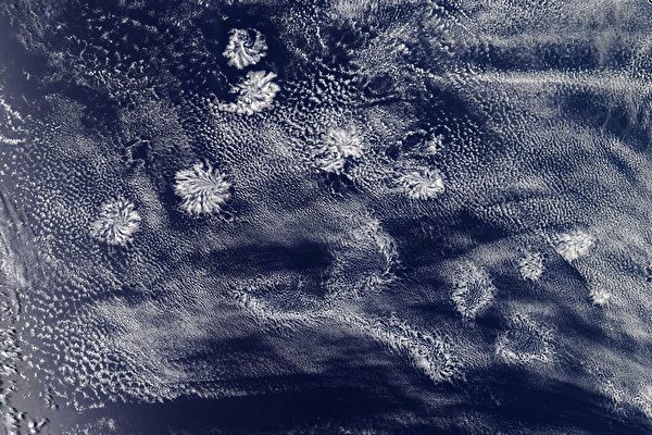它们是位于澳大利亚西岸海面上的一些大型云朵结构。NASA称它们是“一组低对流云自然形成的独具一格的、放射状结构”。每一朵直径可达差不多300公里,“因此从地面不容易看到它们”。