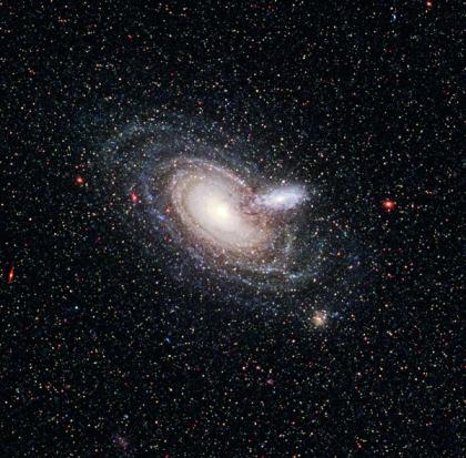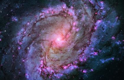 NASA的哈勃太空望远镜捕捉到了两个螺旋星云罕见平行的照片。在那个小的、位于前方的星云的外缘,有一个更大的像是背景的星云,而在小的星云中可以看见被抛出的尘埃构成了这个星云的臂。