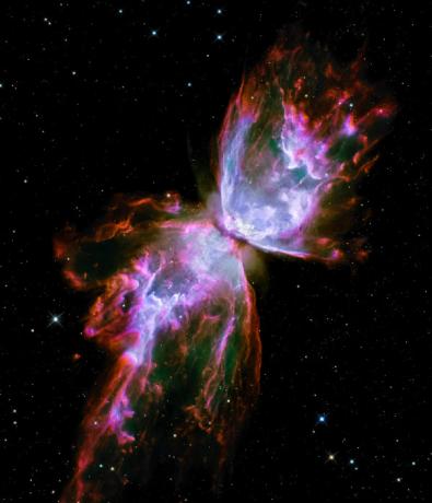 这像极了蝴蝶翅膀的便是蝴蝶星云,由于充满了沸腾的气体,这星云的温度达到了20,000摄氏度,并以每小时950,000公里的速度在太空中穿梭——这速度足以让我们在24分钟内从地球旅行到月球。