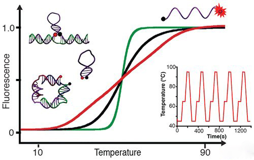 使用DNA作为温度计最主要的好处就是结构简单、可以人工编码。David Gareau是这篇论文的第一作者,他解释说:“DNA中包含了4中脱氧核苷酸:ATGC,其中A和T配对,G和C配对。碱基之间是由氢键连接的,AT之间有两个氢键,GC之间有三个氢键。所以当GC配对在DNA中比例较大时,解链就需要更多的能量。利用这样的结构特点,我们可以制造出在特定温度条件下解链的DNA。”另一位作者Arnaud Desrosiers补充说:“为了能看到这些微观的变化,我们在这些DNA结构中加上荧光标记,这样我们就制造出了长度仅有5纳米的温度计。”