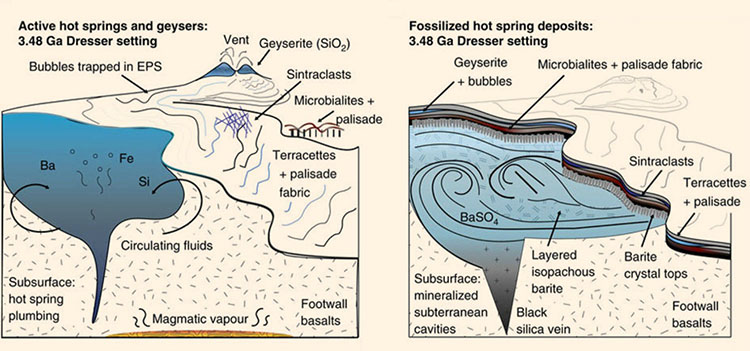 在研究来自澳洲西部皮尔巴拉克拉通(Pilbara Craton)内的一块远古时代的Dresser Formation地质板块的温泉沉积物时,新南威尔斯大学的科学家发现早期生命的化石证据。这些保存完好的沉积物大约有35亿年,而且含有硅华(geyserite)的证据,这是一种只在陆地温泉环境中发现的矿床。
