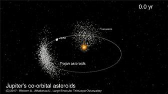 除了逆行之外,它还和木星是所谓的共轨(co-orbital),共轨是指有一个轨道,带领着它足够接近一颗庞大的星球(在此是指木星),来回应重力的巨大拉力。