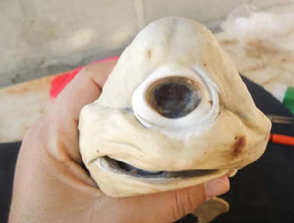独眼鲨鱼:独眼鲨鱼是非常罕见的,它们有着异常可怕的样貌。正常的鲨鱼都有两只眼睛,而独眼鲨鱼事实上是一种独眼畸形,也能够出现在人类和其它动物身上。这只独眼鲨鱼是在墨西哥发现的,一位渔夫在另一只大鲨鱼的腹中发现了它。