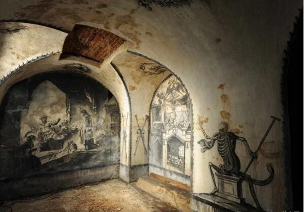这些绘画于2011年被发现,当时是这座地窖数十年来首次开放。很多作品受荷兰艺术的影响,包括伦布兰特(Rembrandt)的作品副本。艺术家的身份仍然是个谜。一些人推测,作者可能是奥地利的科斯马斯(Cosmas)或者维也纳画家托拜厄斯·波克(Tobias Pock)。两人都曾与圣方济会托钵僧一同工作。至于主题是由艺术家选择还是地窖的赞助人,Kolowrat家族的伊丽莎白·阿波罗尼亚伯爵夫人(Countess Elisabeth Apollonia)选择,仍然未知。