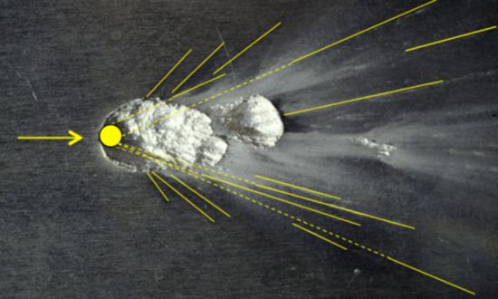 与之不同的是,形成那些怪异沟槽的碎块并不是朝着最后形成的撞击坑方向,并且这些碎块是在撞击初始点形成的。实验室也证明,这些碎块形成的沟槽并不朝向最后的弹坑。桑迪亚国家实验室以此建立的模型随后也证明月球上大尺度的撞击也会形成相似效果。