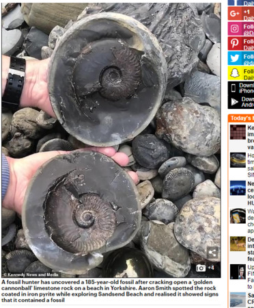 对于史前远古的生态考古,一直以来都备受关注,尤其化石部分于当代更是拍卖上竞争极高的标买品。22岁医学生亚伦 (Aaron Smith) 日前在英国约克郡惠特比Sandsend海滩散步时,突然发现了一个金色的球,尺寸比普通足球小一点。本身就对化石很感兴趣的他,很快就发现眼前的“金球”并不寻常。