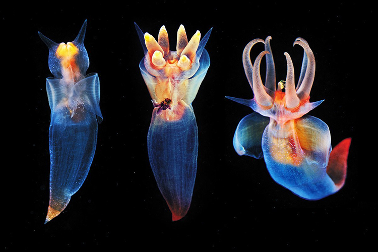 裸海蝶还有一个特点,那就是它们是雌雄同体的生物。而且,它们年幼的时候是雄性,成年期间则会慢慢生出卵子。也就让它们身上同时有精子和卵子存在。在交配时,两只裸海蝶会接在一起,为对方卵子授精、产卵繁殖。
