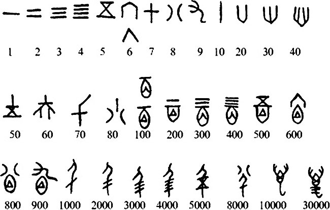 考古学家发现,最迟在商代时中国已采用了十进位值制。从现已发现的商代陶文和甲骨文中,我们可以看到当时已能够用一、二、三、四、五、六、七、八、九、十、百、千、万等十三个数字,记十万以内的任何自然数。这些记数文字的形状在后世虽有所变化,最终变成为现在的写法,但这种记数方法却从没有中断,一直被沿袭,并日趋完善。在这漫长的几千年里,除了中国之外,在世界其他地方也曾无师自通地出现了类似的计数法。这表明,十进制绝非偶然产生的,背后必有深意。
