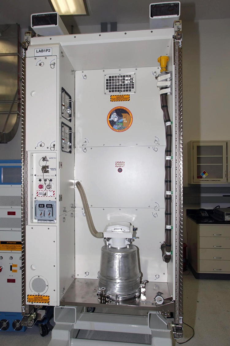 相对来说,在太空上撒尿要容易得多。配备风扇的排风管道会吸走尿液,并且防止尿液漂浮到空中。照片右上角有个黄色圆锥体,那就是输送尿液的管路。八天后,80~85%被收集起的尿液会再度变回饮用水,让宇航员们饮用。