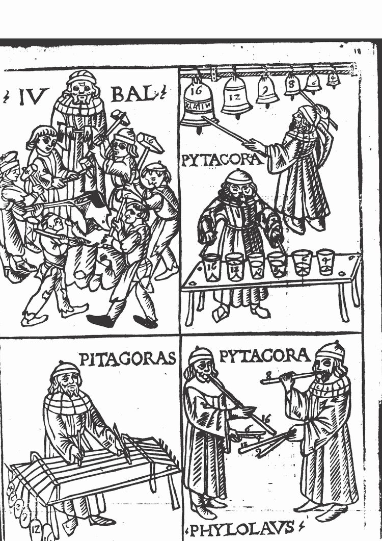 关于“毕氏音程”的传说就是很好的例子。话说毕氏某天经过一间打铁舖,听到打铁声竟然相当悦耳,便好奇心大发,当场做起研究。由于他聪明绝顶,很快发现了其中的奥秘。原来四名铁匠所用的锤子,重量分别是6, 8, 9, 12(斤)──简单整数比!于是他赶紧冲回家,改用琴弦来做实验,很快就归纳出类似的规律:只要两条琴弦的长度成简单整数比,例如4:3, 3:2, 2:1,发出的声音就会和谐悦耳。用现代术语来说,这三组音程分别是完全四度(相差5个半音)、完全五度(相差7个半音)以及完全八度(相差12个半音)。