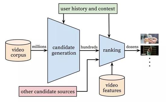 两阶段的推荐方法允许我们从一个很大(数百万)的语料库中进行推荐,与此同时还仍有在设备上出现的少量视频是个性化的吸引用户的内容。此外,这个设计能够和其他源生成的候选进行混合,例如在这一项早期工作[3]中描述的。