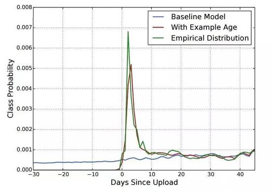 我们发现使用训练样本的年龄作为输入特征,移除了相对于过去的固有偏差(bias),并允许模型表达受欢迎视频的时间依赖行为。这种改进的离线保持了精确率,同时在A/B测试中显著地增加了最近上传视频的观看时间。