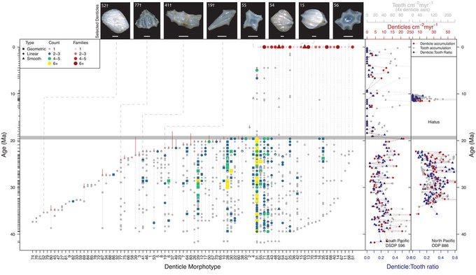 根据外媒报道,耶鲁大学的希伯特(Elizabeth Sibert)和鲁宾(Leah Rubin)指出,对比埋在海底5700米深处的古代鲨鱼细齿(denticles)和其他鱼类牙齿数量,来确定鲨鱼群族数量的长期变异情况。
