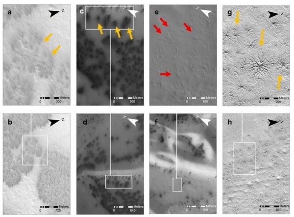 “火星蜘蛛”每年春天都会出现在火星南极的“神秘地形”附近,此一历史性研究能帮助科学家更加了解火星上气候变化。(图自NASA)