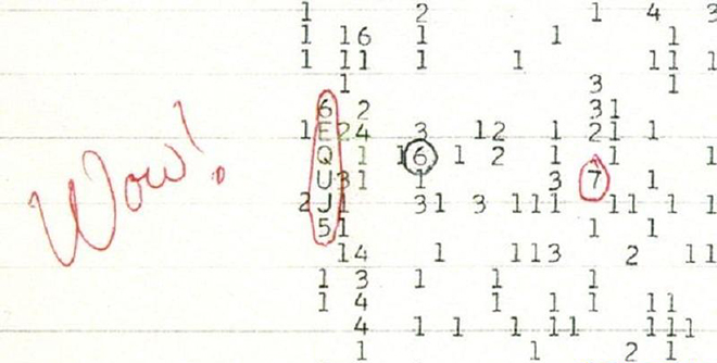 奇怪的宇宙信号:1977年,Jerry Ehman在扫描太空无线电信号搜寻外星文明时,发现了一种持续了72秒的神秘信号。他也在信号的原始打印纸上写下了著名的“WOW!”。这种信号似乎来自于大约120光年外的人马座。然而后来研究人员就再也未接受到过这种信号。正如《国家地理》所写的:“这种信号的频率使其无法被认为是噪音,如果我们要发送信号与外星文明联系,这就是我们要使用的频率。”