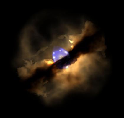 但去年的观测结果暗示,该原恒星的恒星风在其极点流动得更快(如图),近日,研究人员在《科学》杂志网络版上报告称,该天体的磁场开始与其周围更大的气体和尘埃云相匹配。研究人员解释称,当遭遇盘绕在周围的环形尘埃和气体盘时,从该原恒星赤道喷涌出的物质流速度大幅减缓。