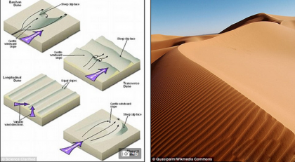 关于线型沙丘形成的另一种形成理论是新月形沙丘具有重要作用,新月形沙丘是一种月牙状沙丘(左图上方),是在一个接近单向风力作用下形成的沙丘。如果风力以一个方向吹拂沙丘,它将形成新月形结构,但是如果风向季节性改变,将形成线型沙丘(左图中心和右图中的摩洛哥沙漠)。