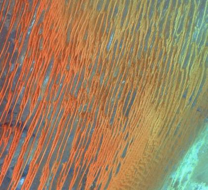 目前,美国宇航局地球资源7号卫星拍摄到撒哈拉沙漠“彩虹线型沙丘”,该沙丘具有单向脊线,长度达到160公里。图中呈现的彩虹丝带沙丘和图案条纹是舍什沙漠,位于阿尔及利亚西南部荒芜沙海。然而形成这种纵向沙丘结构的具体原因并不清楚。