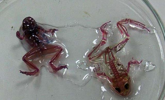 据悉,科学家们在俄罗斯中部抓到了60只这种突变的透明蛙,它们通体透明,内脏、骨骼等都看得一清二楚,而其中不少只身上都有再增生出额外的脚趾。乌拉尔联邦大学(Ural Federal University)的教授弗拉基米尔(Vladimir Vershinin)指出,这种透明蛙很可能是受到环境污染的影响,导致它们先天的色素沉淀有了缺陷,才会变得全身透明,“蛙卵可能失去了保护膜,没办法免于受污染的环境。”