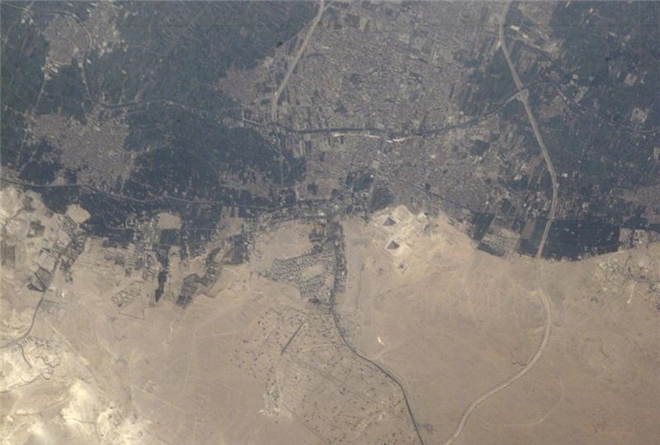 吉萨大金字塔群:从这张照片的中心你可以看到微小的三角形阴影,那些阴影和阴影下的小斑点事实上是人类有史以来建造的一些最令人惊叹的建筑。它们就是三座非常著名的古埃及金字塔:吉萨大金字塔群。三座金字塔中最高的接近500英尺高,但是从太空中看,它也只不过是埃及沙漠中的一个小点。