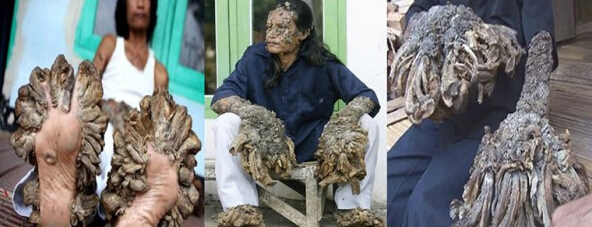看起来彷彿树枝从人体皮肤长出来,实际上是疣状表皮发育不全。当然了,长出来的并不是树枝。这些东西是疣,而且阳光的照射会使情况加剧;这些疣好发于生命初期,稍后将会变成恶性病症。
