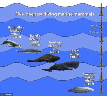 根据2014年公布的一项研究发现,居氏突吻鲸的潜水深度位居所有哺乳动物之首,达到9816英尺(约合2992米),几乎赶上7座帝国大厦,在水下停留时间也达到惊人的138分钟。