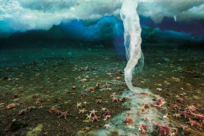 一个 brinicle看起来几乎像一个水下结晶。它是在咸水从海冰中泄漏出来的时候形成的,然后它沉入海中并创造了这个令人难以置信的水下冰雕。由于这些现象形成所需的是低温环境,它们只发生在南极和北极周围的海洋水域。