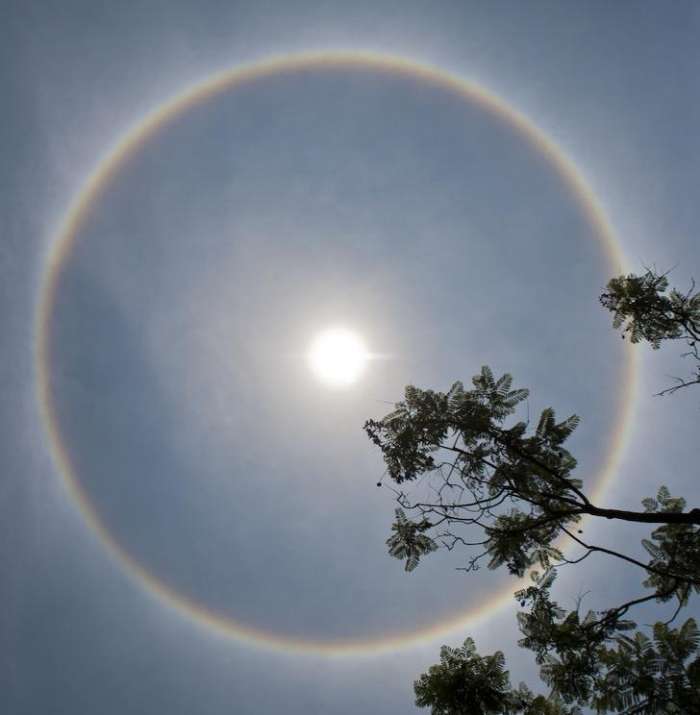 光环是在太阳,月亮甚至街灯附近出现的发光环。这种现象是由太阳光与悬浮在大气中的冰晶(在3-6英里的高度)相互作用产生的。光被冰晶反射和折射,并可能因分散而分裂成颜色。有许多种类似圆圈和弧形的光晕 - 你可能在寒冷的冬日里看到。