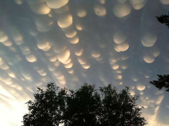 这些云被称为mammatus(意为“乳房云”)。它们由冷空气形成,与通过暖空气上升的云层相反产生口袋。这个有趣的云只持续平均10分钟,但整个乳房群可以持续15分钟到几个小时。