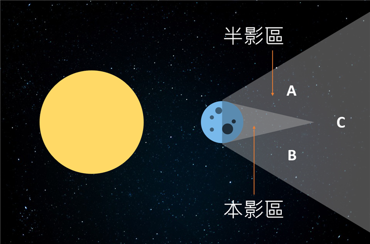 影子可以分为“本影区”和“半影区”。在全影区中,所有的光线完完全全地被遮蔽,好像光源不存在一样。而在半影区中,只有部分的光线被遮住,光源就像是缺了一角。如图一所示,月球的本影和半影区中的A,B处分别会造成“日全蚀”和“日偏食”。同样属于半影区,但在本影区的正后方C的部分会看到“日环蚀”。这是因为月球距离太远,看起来太小,不足以完全遮蔽太阳(如图二照片)。