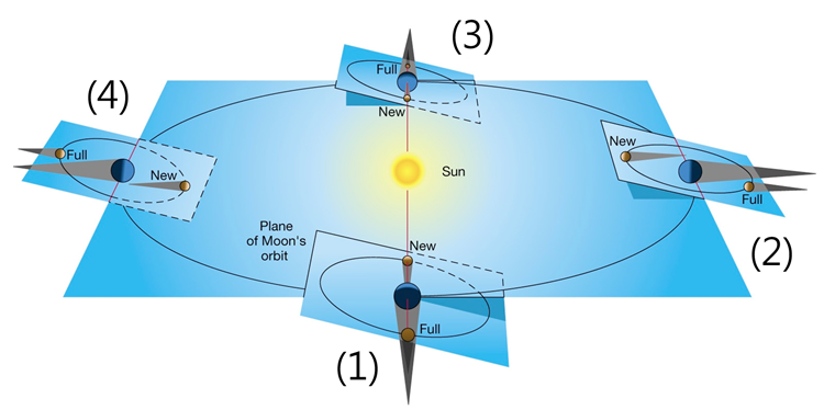 图三、地球和月球公转轨道的示意图。黄道面和白道面夹了大约5度角。每年大约有两次机会太阳、月亮和地球三者依序连成一直线。