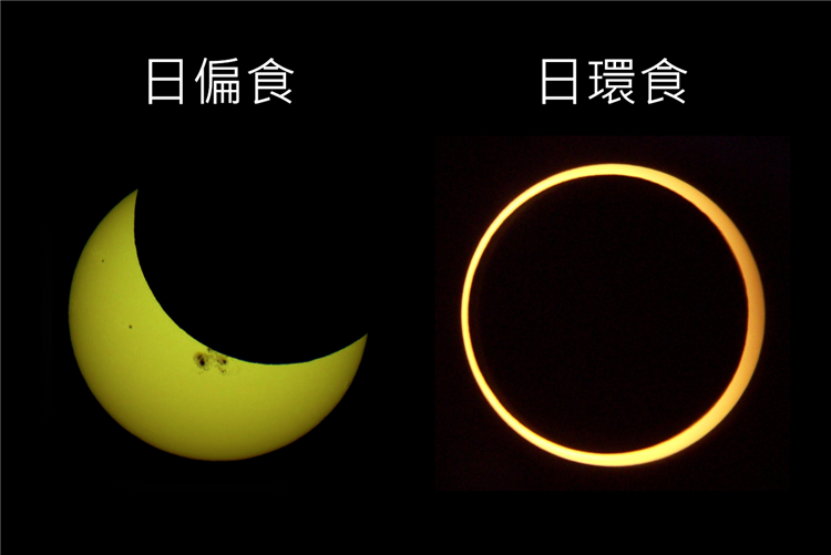 图二、(左)2014年10月23日的日偏食及(右)2012年5月20日的日环食。