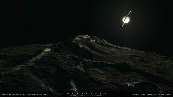 模拟在土星卫星土卫八的低轨道期间所拍摄的镜头,这个场景显示沿着离开卫星圆周的赤道脊的圆屋顶定居点。