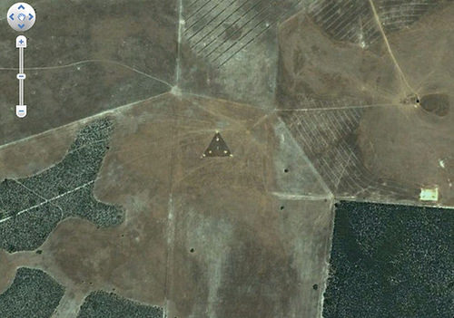 如果我们看着南纬 30 度 30 分 38.44 秒和东经 115 度 22 分 56.03 秒的地方,我们会发现一个奇怪的三角形闪着亮光,这东西就位在农地中间。当这个神秘物体在 2007 年被第一次拍到,幽浮专家们很快地帮它取了一个名字“ 三角幽浮 ”,他们认为它被拍到的当下正盘旋在地球上空。