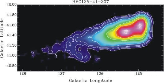 Westmeier利用了澳洲Parkes天文台和德国Effelsberg 100m无线电望远镜所进行的巡天HI4PI观测数据,他们把跟银河系相同速度的云盖掉来独立出这些云。