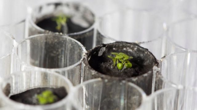 研究人员在 12 个用营养液润湿的容器中埋下三、四粒种子,然后将它们放在大约 73 华氏度(23 摄氏度)的实验室中,置于发出粉红色光线的 LED 灯下。