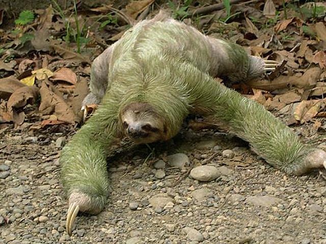 生活在美洲中南部热带雨林里的成年三趾树懒,身长约70厘米,体重为4~7公斤,有着短而高的头骨,小耳朵,短鼻子和逐渐退化的尾巴,外形酷似人类。但它却并不会在地面上行走,只能依靠较长的前肢拖动身体而缓慢前行,其最快速度达到每秒6厘米;而当雨季来临,地面涨水,三趾树懒就能发挥自己相对较擅长的游泳技能和憋气神功——以每秒18厘米的速度,闭气40分钟在水中前进。尽管如此,它只要被任何一种食肉性动物盯上,就绝无逃生的可能。