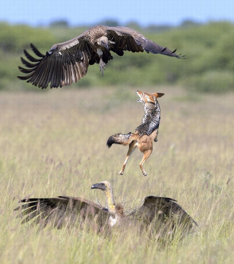 照片中,一只豺狼克服重力,跳跃至空中,搏击秃鹰。饥不择食的秃鹰露出利爪,直扑豺狼的猎物。