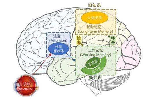 人的学习过程中(如下图),大脑对外部环境进行感知,注意机制对感兴趣的信息保持关注;在工作记忆中,新知识在旧知识的基础上通过检索被快速建立起来;而后经过神经元的加工整理,形成难被遗忘的长时记忆。由此,人不断地从生活经验中建立并整合知识,从而学会处理日益复杂的任务。在持续不断的学习过程中,对以往知识检索利用,使得人们只需要少量的训练就能快速地学会新的任务。综上,一个真正的智能系统应具备以下两方面的作用
