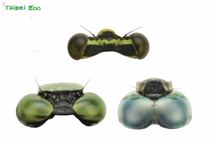 由图可见豆娘的哑铃状头部(上)与蜻蜓距离较近的复眼(下)。