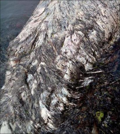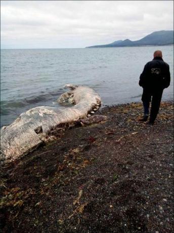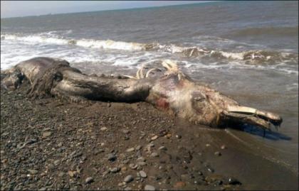遗体在Sakhalin岛的海岸边搁浅,一部分组织已经开始腐烂,还有些身体都已经四分五裂的散了,还暴露出体内的骨骼。很多人从轮廓上推测这大概是一只海豚,不过这个推测并不准。