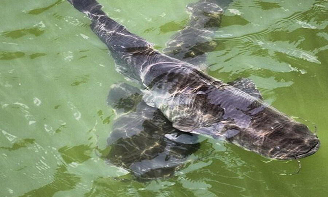 图中巨大鲶鱼在当年切尔诺贝利反应堆附近的水池中游动。