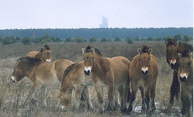 图中是荒凉的切尔诺贝利灾区出现的成群野马。